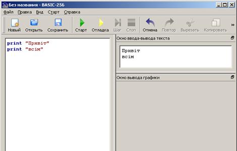 Після того, як ви наберете текст цієї програми, клацніть мишкою по кнопці Старт на панелі інструментів. У вікні для вводу-виводу тексту з'являться слова: "Привіт" на першому рядку і "всім" – на другий (рис. 1.2).