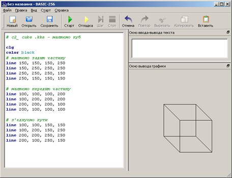 Вікно BASIC-256 розділене на 5 секцій: рядок меню, панель інструментів, область тексту програми, вікно введення-виведення тексту, вікно виведення графіки (див. рис. 1.1).