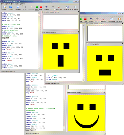 Текст програми складається з інструкцій, які вказують комп'ютеру, що і як потрібно робити. Ви будете набирати текст програм, змінювати і виправляти їх код саме в цьому вікні, а також завантажувати сюди збережені раніше програми.