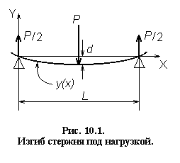 Если прямой упругий стержень обоими концами свободно положить на твердые опоры и нагрузить в середине грузом весом P, то середина стержня опустится, т. е. стержень согнется (рис. 10.1).