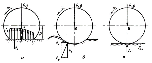 Сопротивление качению колеса с пневматической шиной по недеформируемой дороге возникает в основном за счет затрат энергии на деформацию шины, так как деформации дороги незначительны. Работа, затраченная на участке 1–2 (рис. 6.4, а) на деформацию шины, больше, чем возвращенная на участке 2–3 (рис. 6.4, а) для восстановления ее формы, так как часть энергии расходуется на внутреннее трение резины. Поэтому давление pz на участке 1–2 больше, чем на участке 2–3, и равнодействующая нормальных реакций Rn, cмещенная относительно оси 0 (рис. 6.4, а) в сторону движения, препятствует качению колеса.