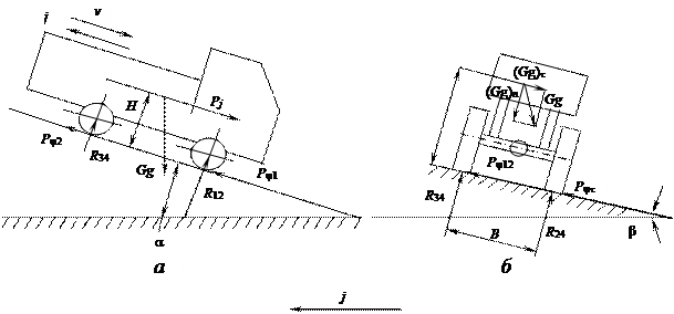 Устойчивость ПА против опрокидывания. Опрокидывание ПА может произойти из-за действия поперечной составляющей силы веса (Gg)τ при движении по косогору или из-за действия силы инерции Pj при движении на повороте. Опрокидывание ПА наступает при разгрузке колес одной стороны автомобиля, т. е. при R13= 0 (рис. 6.10, б, в). Поэтому для движения ПА по косогору и на повороте необходимо выполнение соответственно двух условий: