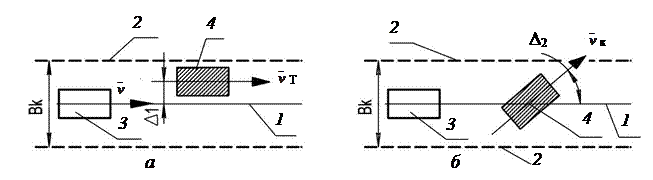 а – траекторией; б – курсом; ВК – ширина разметки полосы движения; ∆1 – поперечное смещение; ∆2 – угловое смещение; 1 – центр полосы движения; 2 – разметка;