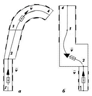 Неравенства (6.58) и (6.59) составлены без учета деформации шин, подвески и кузова АТС, поэтому значения К, вычисленные по экспериментальному значению b, на 10 – 15 % меньше, чем определенные по формуле (6.64). При определении коэффициента К пожарных автоцистерн необходимо учитывать также уменьшение К из-за смещения центра масс жидкости относительно цистерны при частичном ее заполнении. Если масса жидкости составляет не более 30 % от общей массы ПА, то уменьшение коэффициента К не превышает 5 – 7 % и определить его экспериментально сложно. Поэтому для оценки эффективности мероприятий по обеспечению безопасности движения пожарных автоцистерн необходимо использовать другие виды испытаний на устойчивость управления АТС. Такими видами испытаний являются «поворот» и «переставка» (рис. 6.12).