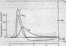 На рис. 7 показаны изменения натриевой (gNa) и калиевой (gk) проницаемости мембраны нервного волокна во время фиксированной деполяризации. Как отмечалось, величины gNa и gK отражают число одновременно открытых натриевых или калиевых каналов. Как видно, gNa быстро, за доли миллисекунды, достигла максимума, а затем медленно начала снижаться до исходного уровня. После окончания деполяризации способность натриевых каналов вновь открываться постепенно восстанавливается в течение десятков миллисекунд.