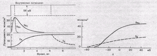 На рис. 6 показаны изменения натриевой и калиевой проницаемости мембраны во время генерации потенциала действия в гигантском аксоне кальмара. Аналогичные отношения имеют место в других нервных волокнах, телах нервных клеток, а также в скелетных мышечных волокнах позвоночных животных. В скелетных мышцах ракообразных животных и гладких мышцах позвоночных в генезе восходящей фазы потенциала действия ведущую роль играют ионы Са2+. В клетках миокарда начальный подъем потенциала действия связан с повышением проницаемости мембраны для Nа+, а плато потенциала действия обусловлено повышением проницаемости мембраны и для ионов Са2+