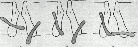 Канал (1) образован макромолекулой белка 2), суженная часть которого соответствует «селективному фильтру». В канале имеются активационные (т) и инактивационные (h) «ворота», которые управляются электрическим полем мембраны. При потенциале покоя (а) наиболее вероятным является положение «закрыто» для активационных ворот и положение «открыто» для инактивационных. Деполяризация мембраны (б) приводит к быстрому открыванию т-«ворот» и медленному закрыванию п-«ворот», поэтому в начальный момент деполяризации обе пары «ворот» оказываются открытыми и через канал могут двигаться ионы в соответствии с их концентрационными и электрическими градиентами. При продолжающейся деполяризации (о) инактивационные «ворота» закрываются и канал переходит в состояние инактивицин.