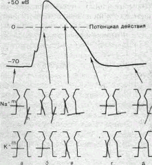 На рис. 9 схематически показано состояние натриевых и калиевых каналов в различные фазы развития потенциала действия.