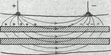 Существуют два способа подведения тока к тканям для измерения порога раздражения и, следовательно, для определения их возбудимости. При первом способе — внеклеточном — оба электрода располагают на поверхности раздражаемой ткани. Условно принимают, что приложенный ток входит в ткань в области анода и выходит в области катода (рис. 11). Недостаток этого метода измерения порога заключается в значительном ветвлении тока: только часть его проходит через мембраны клеток, часть же ответвляется в межклеточные щели. .Вследствие этого при раздражении приходится применять ток значительно большей силы, чем необходимо для возникновения возбуждения.