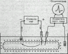 Рис.12. Раздражение и отведение потенциалов через внутриклеточные микроэлектроды. Объяснение в тексте.