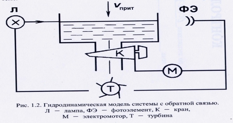 Принцип обратной связи. Гидродинамическая модель (см.рис.1) снабжена устройством, которое увеличивает или уменьшает скорость оттока воды при поворачивании крана на выходе из сосуда в зависимости от смещения в нем уровня жидкости. Поворот крана электромотором происходит по сигналу от фотоэлемента. Возникающий в фотоэлементе ток зависит от степени поглощения света, которая меняется с уровнем жидкости в сосуде. Питание лампочки фотоэлемента и электромотора осуществляется от турбины, лопасти которой вращаются выходящим потоком воды. В такой модели по принципу обратной связи поддерживается в определенных пределах уровень жидкости при изменении скорости притока воды за счет саморегуляции.