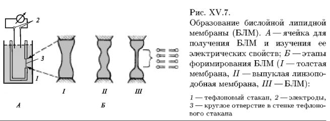 Липиды, спонтанно образующие ламеллярные слои, обычно способны формировать бислойные структуры (БЛМ или «черные» пленки) на небольших отверстиях в тонких гидрофобных материалах. Это явление впервые было описано О. Мюллером и соавторами, которые получили БЛМ из фосфолипидов мозга на небольших отверстиях (0,5-5,0мм2) в тефлоновой перегородке, разделяющей две водные фазы. Доказав бислойность сформированных мембран, авторы с помощью простой электроизмерительной техники охарактеризовали важнейшие электрические параметры этих мембран. Относительная простота получения БЛМ, широкий спектр применения разнообразных электроизмерительных методов исследования, возможность изменять в широких пределах липидный состав БЛМ и состав омывающих растворов, включать в БЛМ разнообразные модификаторы барьерных свойств мембран, функционально активные элементы биологических мембран — все это быстро обеспечило этим искусственным мембранным системам центральное место в современной экспериментальной мембранологии. Общая схема ячейки для формирования БЛМ и несколько последовательных этапов формирования бислойной структуры приведены на рис. XV. 7. Процесс образования БЛМ начинается с нанесения небольшого количества подходящего липида, растворенного обычно в жидких углеводородах (гексан, октан, декан и др.), на отверстие в тефлоновом стаканчике (рис. XV. 7,I). Далее эта толстая пленка самопроизвольно утоньшается вплоть до образования бислойной структуры (рис. XV.7, III).