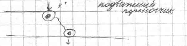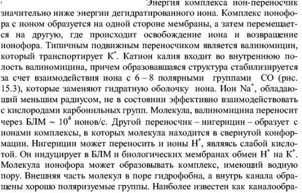 Перенос иона через мембрану с участием переносчика включает стадии образования комплекса иона с ионофором на одной стороне мембраны, перемещения комплекса через мембрану, освобождения иона на другой стороне и возвращения ионофора. Возможны две схемы работы переносчика: малая «карусель», когда ионофор не выходит из мембраны, и большая «карусель», когда ионофор проходит мембрану насквозь, а образование и распад комплексов протекает в неперемешиваемых слоях около мембраны. По механизму малой карусели осуществляется, например, перенос К+ в присутствии валиномицина. Среди соединений, относящихся к ионным переносчикам, центральное место занимают макроциклические антибиотики, выделенные из микроорганизмов.