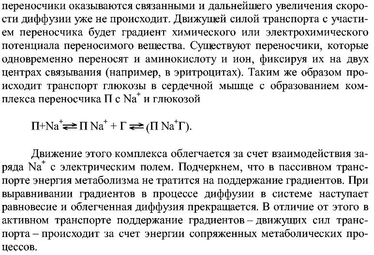 в начальный момент времени. По мере роста S0 все переносчики оказываются связанными и дальнейшего увеличения скорости диффузии уже не происходит. Движущей силой транспорта с участием переносчика будет градиент химического или электрохимического потенциала переносимого вещества. Существуют переносчики, которые одновременно переносят и аминокислоту, и ион, фиксируя их на двух центрах связывания (например, в эритроцитах). Таким же образом происходит транспорт глюкозы в сердечной мышце с образованием комплекса переносчика П с Na+ и глюкозой