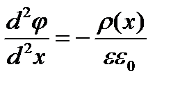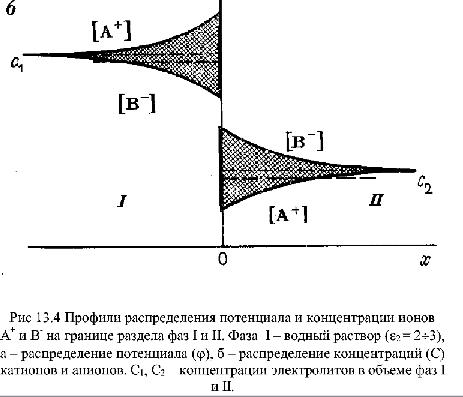 Возникновение межфазной разности потенциалов связано с разделением зарядов в окрестностях границы раздела и с образованием двойного электрического слоя. Вопрос о характере распределения электрического потенциала в двойном слое, в частности вблизи границы раздела вода-неполярный растворитель, решается на основании одного из основных уравнений электростатики — уравнения Пуассона. Для рассматриваемого одномерного случая (одна пространственная координата — х) это уравнение имеет вид