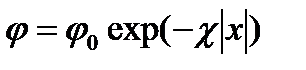 — значения электрического потенциала на границе раздела и в плоскости х, измеряемые относительно потенциала в объеме фазы: |x|—абсолютное значение координаты х. Уравнение (XVIII.4.7) показывает, что электрический потенциал изменяется экспоненциально с изменением расстояния от границы раздела (рис. XVIII.4). Двойной электрический слой распространяется в глубь обеих фаз, по обе стороны от поверхности раздела. Крутизна изменения потенциала в зависимости от расстояния определяется величиной х, которая зависит от концентрации ионов в данной фазе и диэлектрической проницаемости. Величина