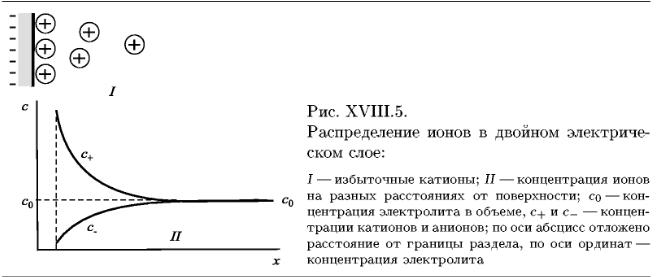 Согласно представлениям, развитым в работах Г. Гуи и Д. Л. Чэпмена (1910) распределение ионов в области заряженной поверхности определяется двумя факторами: электростатическим притяжением, удерживающим противоионы у поверхности, и тепловым движением этих ионов, стремящимся, наоборот, к выравниванию их концентраций в поверхностном слое и объеме. В устанавливающемся равновесии плотность распределения ионов около заряженной поверхности убывает с увеличением расстояния от поверхности. Равновесные концентрации катионов с+ и анионов с- в поверхностном слое и в объеме раствора представлены схематически на рис. XVIII.5. Слой раствора с измененными концентрациями вблизи поверхности называется диффузным. В зависимости от условий его толщина изменяется на несколько порядков — от десятых нанометра до микрометров.