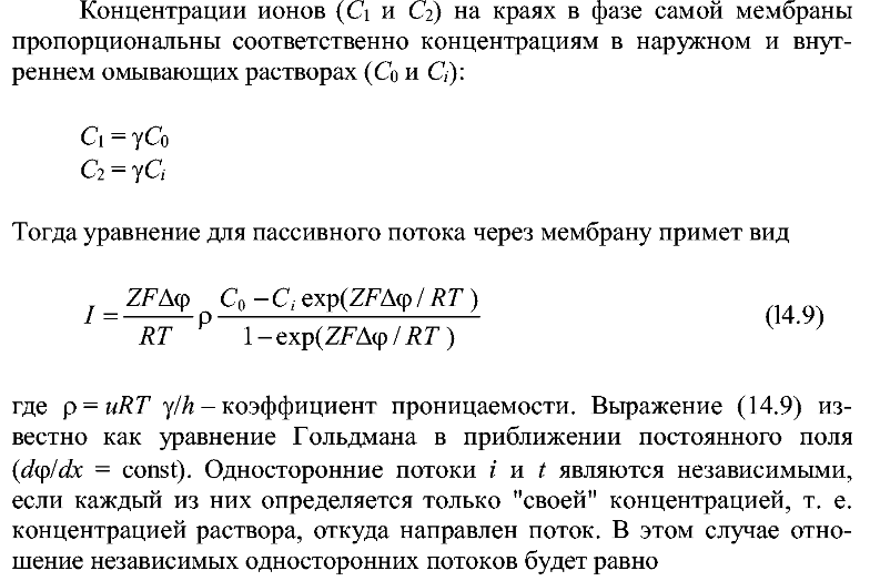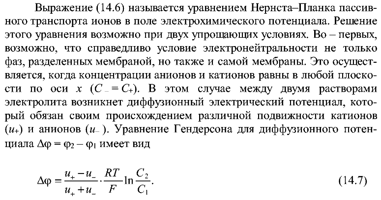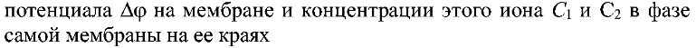 которое называется уравнением Нернста для равновесного потенциала на мембране. Оно показывает, что равновесный потенциал на мембране определяется соотношением концентраций электролита в обеих фазах.