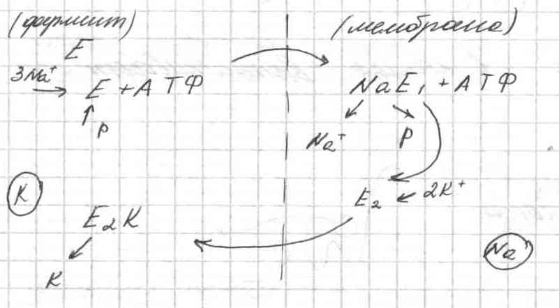 - Опыты с меченой АТФ-азой показывают, что при гидролизе одной молекулы АТФ происходит транспорт двух ионов калия внутрь клетки и выход из клетки трех (иногда двух) ионов натрия.