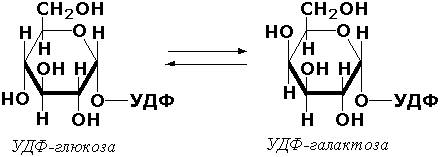 Эпимеразами называются ферменты, действующие на субстраты с несколькими асимметрическими атомами углерода. К таким ферментам относится УДФ-глюкозо-эпимераза (УДФ-глюкоза-4-эпимераза, КФ 5.1.3.2). участвующая в процессах взаимопревращения моносахаридов: