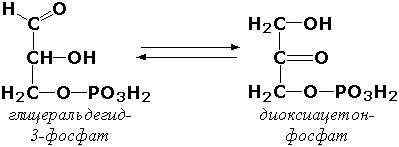 Внутримолекулярные оксидоредуктазы - изомеразы, катализирующие взаимопревращения альдоз и кетоз. При этом происходит окисление СН-ОН-группы с одновременным восстановлением соседней С=О-группы. Так, триозофосфатизомераза (D-глицеральдегид-3-фосфат-кетол-изомераза, КФ 5.3.1.1) катализирует одну из реакций углеводного обмена: