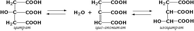 Следует подчеркнуть, что не все биохимические процессы. результатом которых является изомеризация, катализируются изомеразами. Так, изомеризация лимонной кислоты в изопимонную происходит при участии фермента аконитатгидратазы (цитрат (изоцитрат)-гидро-лиаза, КФ 4.2.1.3), катализирующей реакции дегидратации-гидратации с промежуточным образованием цис-аконитовой кислоты: