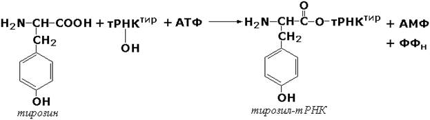 Лигазы, образующие связи углерод-кислород. К ним относится группа ферментов, известных как аминокислота-тРНК-лигазы (аминоацил-тРНК-синтетазы). которые катализируют реакции взаимодействия аминокислот и соответствующих транспортных РНК. В этих реакциях образуются активные формы аминокислот, способные участвовать в процессе синтеза белка на рибосомах. Примером фермента может служить тирозил-тРНК-синтетаза (L-тирозин:тРНК-лигаза (АМФ), КФ 6.1.1.1), участвующая в реакции: