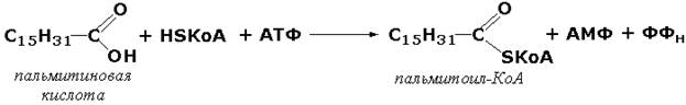 Лигазы, образующие связи углерод-сера. Этот подкласс представлен в первую очередь ферментами, катализирующими образование тиоэфиров жирных кислот с коэнзимом А. При участии этих ферментов синтезируются ацил-КоА - активные формы жирных кислот, способные вступать в различные реакции биосинтеза и распада. Рассмотрим одну из реакций активации жирных кислот, протекающую в присутствии фермента ацил-КоА-синтетазы (карбоновая кислота:коэнзим А-лигаза (АМФ). КФ 6.2.1.2):