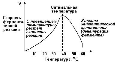 При более низких температурах (0° — 40°С) скорость реакции увеличивается с ростом температуры. При повышении температуры на 10°С скорость ферментативной реакции удваивается (температурный коэффициент Q10 равен 2). Повышение скорости реакции объясняется увеличением кинетической энергии молекул. При дальнейшем повышении температуры происходит разрыв связей, поддерживающих вторичную и третичную структуру фермента, то есть тепловая денатурация. Это сопровождается постепенной потерей каталитической активности.