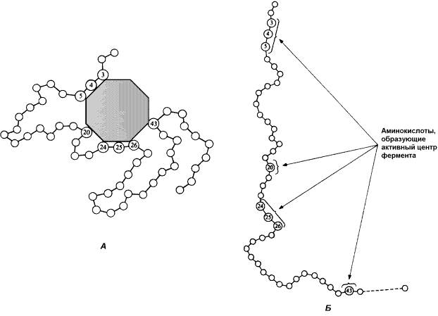 Рисунок 3.3. А. Участие аминокислотных остатков, образующих активный центр фермента, во взаимодействии с субстратом. Б. Положение этих аминокислотных остатков в первичной структуре фермента.