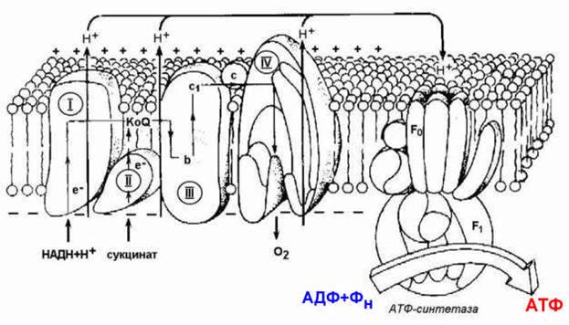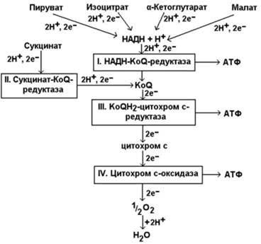 Рисунок 8.2. Ферментные комплексы дыхательной цепи (обозначены участки сопряжения окисления и фосфорилирования):
