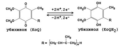 Убихинон (KoQ) – жирорастворимое витаминоподобное вещество, способен легко диффундировать в гидрофобной фазе внутренней мембраны митохондрий. Биологическая роль коэнзима Q – перенос электронов в дыхательной цепи от флавопротеинов (комплексы I и II) к цитохромам (комплекс III).