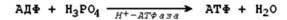 Протоны, выведенные в межмембранное пространство за счёт энергии переноса электронов, снова переходят в митохондриальный матрикс. Этот процесс осуществляется ферментом Н+-зависимой АТФ-синтетазой (Н+-АТФ-азой). Фермент состоит из двух частей (см. рисунок 8.4): водорастворимой каталитической части (F1) и погружённого в мембрану протонного канала (F0). Переход ионов Н+ из области с более высокой в область с более низкой их концентрацией сопровождается выделением свободной энергии, за счёт которой синтезируется АТФ.