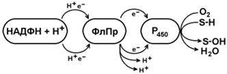Источником электронов и протонов в этой цепи является восстановленный кофермент НАДФН, который образуется в реакциях пентозофосфатного пути окисления глюкозы. Промежуточным акцептором Н+ и е— служит флавопротеин (ФлПр), содержащий кофермент ФАД. Конечное звено в цепи микросомального окисления - цитохром Р-450. Это - сложный белок, хромопротеин, в качестве простетической группы содержит гем. Цитохром Р-450 является монооксигеназой, то есть ферментом, включающим один из атомов молекулярного кислорода в окисляемое вещество. Поэтому цепь реакций микросомального окисления называют также монооксигеназной цепью.