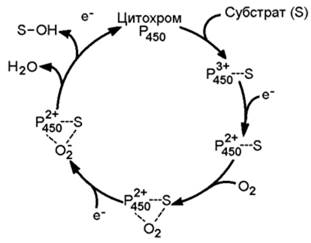 Рисунок 8.10. Механизм реакции гидроксилирования субстрата при участии цитохрома Р450.