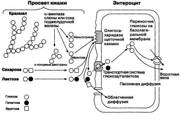 Гидролиз крахмала начинается в ротовой полости. В слюне содержится фермент амилаза, частично расщепляющая крахмал. Основное место переваривания крахмала - тонкий кишечник. Туда поступает амилаза сока поджелудочной железы. Продуктом действия амилазы является мальтоза. Мальтоза далее расщепляется с помощью мальтазы до глюкозы, дисахарид лактоза (содержащаяся в молоке) расщепляется с помощью лактазы до глюкозы и галактозы. Дисахарид сахароза (содержащаяся в пищевом сахаре) расщепляется с помощью сахаразы до глюкозы и фруктозы.