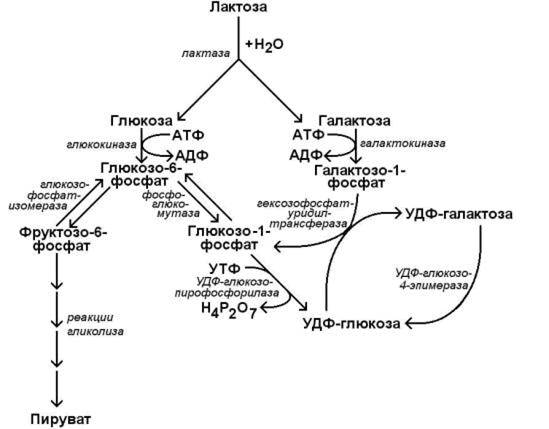 Обмен галактозы начинается с превращения её в галактозо-1-фосфат. Эта реакция катализируется галактокиназой и идёт с использованием энергии АТФ. В следующей реакции при участии гексозофосфат-уридилтрансферазы галактозо-1-фосфат превращается в глюкозо-6-фосфат, одновременно образуется УДФ-галактоза.