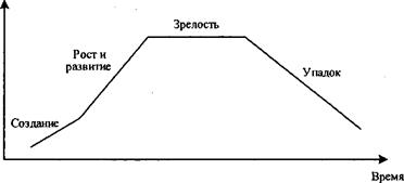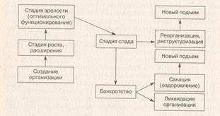 Можно рассматривать жизненный цикл организации. Наиболее распространенный вариант жизненного цикла организации представлен на рис. Ниже, он включает следующие фазы.