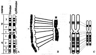 Хромосомные реперы ограничивают районы хромосом, каждый из которых содержит несколько бэндов, а бэнды, в свою очередь, состоят из суббэндов. В метафазных хромосомах различают около 400-500 бэндов, в то время как в хромосомах ранней профазы можно выделить до 1800-2000 бэндов.