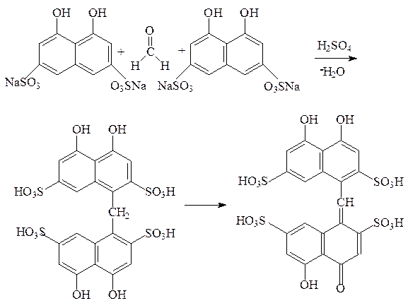 Внешний эффект: появление малиново-красного окрашивания. Серная кислота играет в этой реакции двойную роль: с одной стороны как водоотнимающее средство, с другой стороны конденсирующий агент и окислитель. Можно также использовать кислоту хромотроповую, образуется сиреневое окрашивание.
