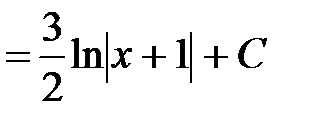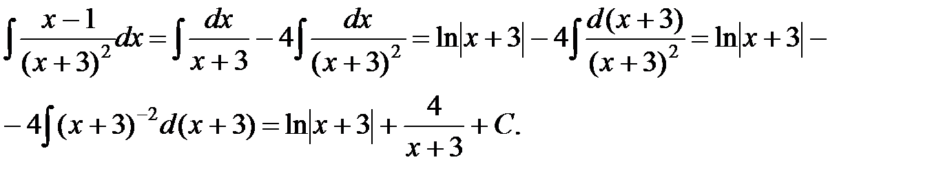 Выделяя в числителе производную знаменателя и представляя интеграл в виде суммы двух интегралов, к которым последовательно применяем формулу (1.2) и табличный интеграл (12), будем иметь: