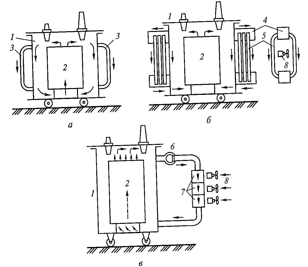 а – типа М; б – типа Д; в – типа ДЦ; 1 – бак; 2 – выемная часть; 3 – охлаждающая поверхность; 4 – коллектор; 5 – трубчатый радиатор; 6 – электронасос; 7 – охладитель; 8 – вентилятор.