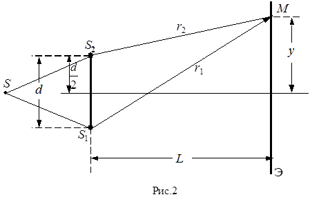 Световые волны являются частным случаем электромагнитных волн. Их длина λ находится в диапазоне (4-7.5) 10 –7 м. В световой волне происходят колебания напряжнностей электрического поля и магнитного поля. Однако действие света на электроны вещества, в основном, определяется напряженностью электрического поля, а влиянием на них напряженности магнитного поля световой волны во многих случаях можно пренебрегать. Поэтому вектор Е называют световым вектором. Будем считать, что источники света S1 и S2 (рис.2) когерентны и плоскости поляризации их световых волн совпадают. Тогда их векторы Е1 и Е2 будут направлены вдоль одной прямой. Это позволяет использовать формулы (7) – (9) для исследования результата интерференции волн в точке М экрана Э, расположенного на расстоянии L от источников. Уравнения волн источников S1 и S2 можно записать в виде