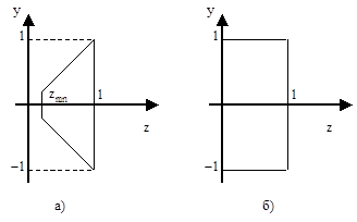 Рис. 33. Изменение видимого объема при перспективном преобразовании: а) до преобразования; б) после преобразования.