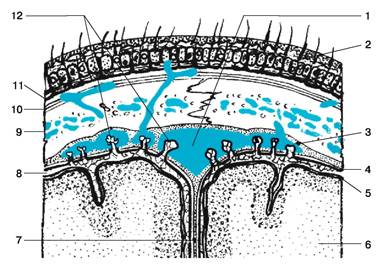 Ближе всего к мозгу прилегает мягкая мозговая оболочка – pia mater еncephali богатая сосудами; она заходит во все борозды и проникает в мозговые желудочки где складки ее с многочисленными сосудами образуют сосудистые сплетения.