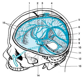 В толще отростков твердой мозговой оболочки находятся лишенные клапанов венозные пазухи (рис. 3). Серповидный отросток dura mater на всем своем протяжении содержит верхнюю сагиттальную венозную пазуху (sinus sagittalis superior), которая прилежит к костям свода черепа и при травмах нередко повреждается и дает очень сильное, трудно останавливаемое кровотечение. Наружная проекция верхней сагиттальной пазухи соответствует сагиттальной линии, соединяющей основание носа с наружным затылочным бугром.