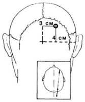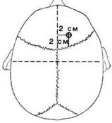Для ориентировки вначале проводят срединную линию от переносья до затылочного бугра (соответствует стреловидному шву) (рис. 7A,B). Затем намечают линию венечного шва, располагающуюся на 10-11 см выше надбровной дуги. От места пересечения этих линий на 2 см в сторону и на 2 см кпереди от венечного шва намечают точи для трепанации черепа. Проводят линейный разрез мягких тканей длиной 3-4 см параллельно сагиттальному шву. Распатором отслаивают надкостницу и в намеченной точке просверливают фрезой отверстие в лобной кости. Очистив острой ложечкой края отверстия в кости, в бессосудистом участке острым скальпелем делают разрез твердой мозговой оболочки длиной 2 мм. Через этот разрез специальной тупой канюлей с отверстиями по бокам производят пункцию мозга. Канюлю продвигают строго параллельно большому серповидному отростку с наклоном в направлении биаурикулярной линии (условная линия, соединяющая оба слуховых прохода) на глубину 5-6 см, что учитывается по шкале, нанесенной на поверхности канюли. При достижении необходимой глубины хирург пальцами хорошо фиксирует канюлю и извлекает из нее мандрен. Жидкость в норме бывает прозрачная и выделяется редкими каплями. При водянке мозга ликвор иногда течет струей. Удалив необходимое количество ликвора, канюлю извлекают и рану зашивают наглухо.