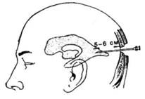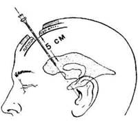 Сделав в указанной точке трепанационное отверстие, рассекают на небольшом протяжении твердую мозговую оболочку, после чего вводят канюлю и продвигают ее кпереди на 6-7 см по направлению воображаемой линии, проходящей от места вкола к верхненаружному краю глазницы соответствующей стороны.