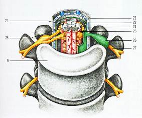 Спинной мозг имеет сегментарное строение. Сегмент – это поперечный отрезок серого вещества спинного мозга и отходящего от него пары спинномозговых нервов. Различают 31 сегмент – 8 шейных, 12 грудных, 5 поясничных, 5 крестцовых и 1 копчиковый. Спинной мозг короче позвоночного канала, место выхода нервов не соответствует уровню межпозвоночных отверстий. Чтобы попасть в соответствующее межпозвоночное отверстие корешкам приходится спускаться вниз. Нижние шейные и верхние грудные сегменты лежат на один позвонок выше, чем тела соответствующих позвонков. В среднем грудном отделе эта разница составляет два позвонка, в нижнем грудном – 3. Поясничные сегменты лежат на уровне X,XI грудных позвонков, крестцовый и копчиковый сегменты – на уровне XII грудного и I поясничного позвонков. В поясничной части нервные корешки идут параллельно пограничной нити и их скопление образует конский хвост, cauda equina.