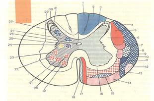 срединной и задней латеральной бороздами. Боковой канатик, funiculus lateralis расположен между передней и задней латеральными бороздами. В белом веществе передних канатиков находятся нисходящие проводящие пути (двигательные), в задних канатиках располагаются восходящие проводящие пути (чувствительные) в боковых канатиках – восходящие и нисходящие проводящие пути. Передний канатик включает следующие проводящие пути: 1. Передний корково- спинномозговой (пирамидный-17) путь, tractus corticospinalis anterior– проводит двигательные импульсы от коры головного мозга к передним рогам спинного мозга. 2. Ретикулярно- спинномозговой путь (13), tractus reticulospinalis – проводит импульсы от ретикулярной формации головного мозга. 3. Передний спинно- таламический путь (15), tractus spinothalamicus anterior проводит импульсы тактильной чувствительности. 4. Покрышечно- спинномозговой путь (18), tractus tectospinalisпроводит импульсы от подкорковых центров зрения и слуха. 5. Преддверно-спинномозговой путь (14), tractus vestibulospinalis идет от вестибулярных ядер VIII пары черепных нервов. Боковой канатик содержит следующие проводящие пути: А.Восходящие – 1. Передний (10) (путь Говерса) и 2.задний (4) (путь Флексига) спиномозжечковые пути, tractus spinocerebellaris anterior et posterior проводят бессознательные проприоцептивные импульсы (бессознательная координация движений) к мозжечку. 3. Латеральный спинно- таламический путь (8), tractus spinothalamicus lateralisпроводят болевую (спереди) и температурную (сзади) чувствительность. 4. Спинно- покрышечный путь (11), tractus spinotectalis идет к среднему мозгу (подкорковым центрам